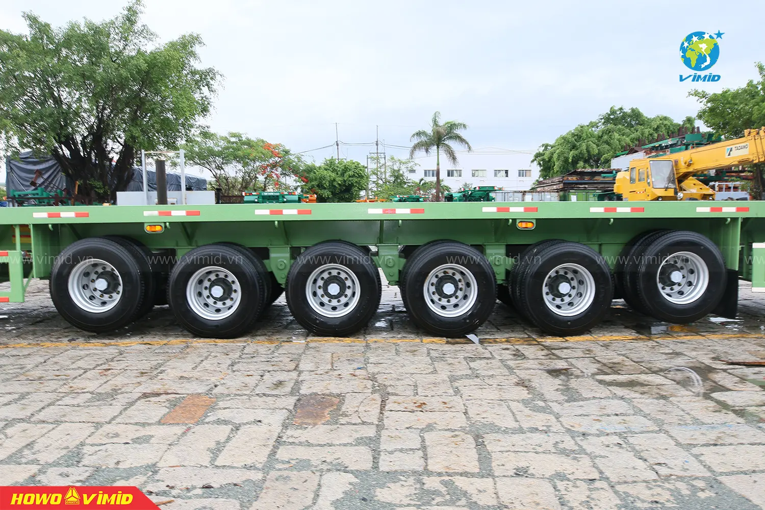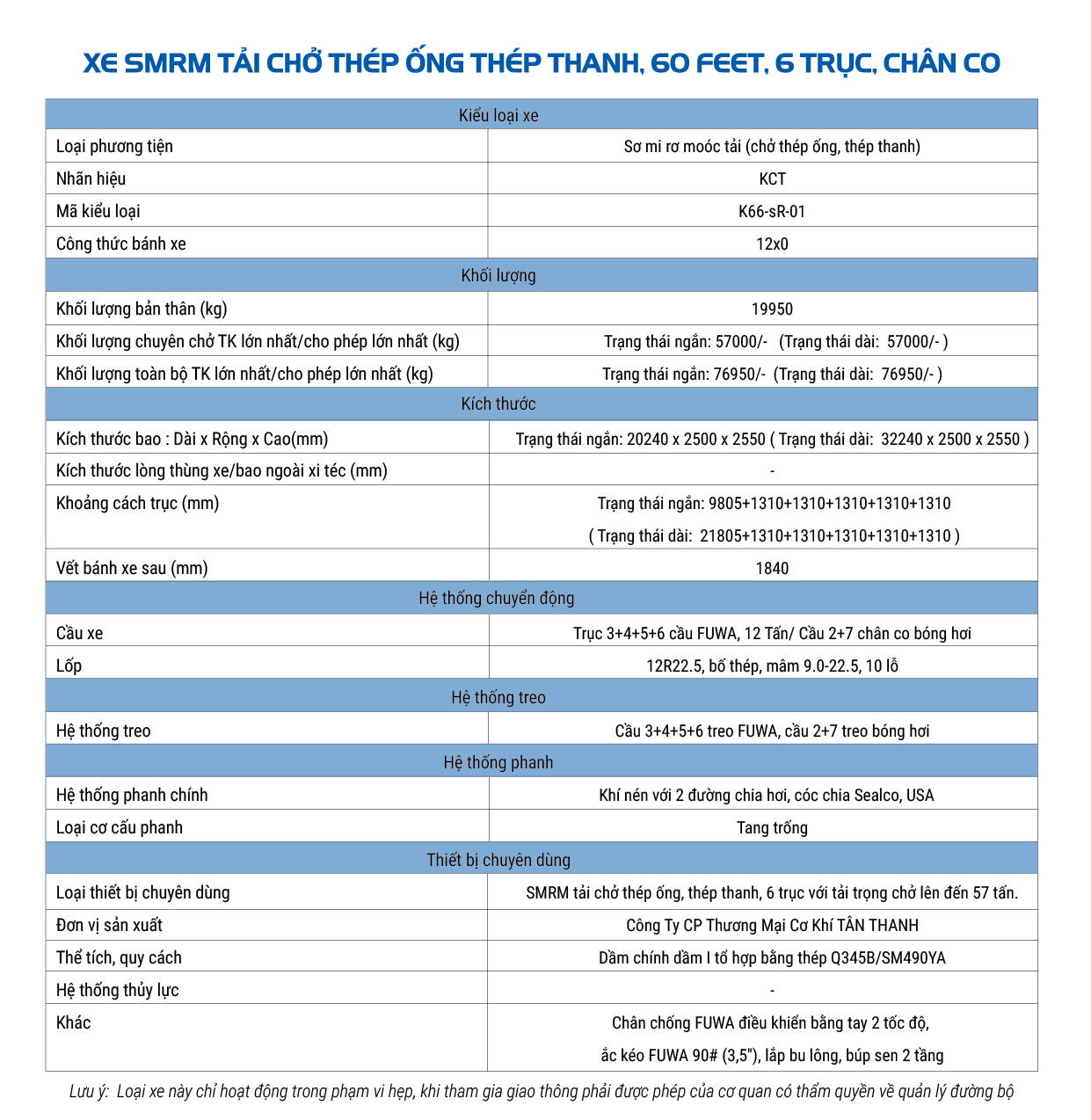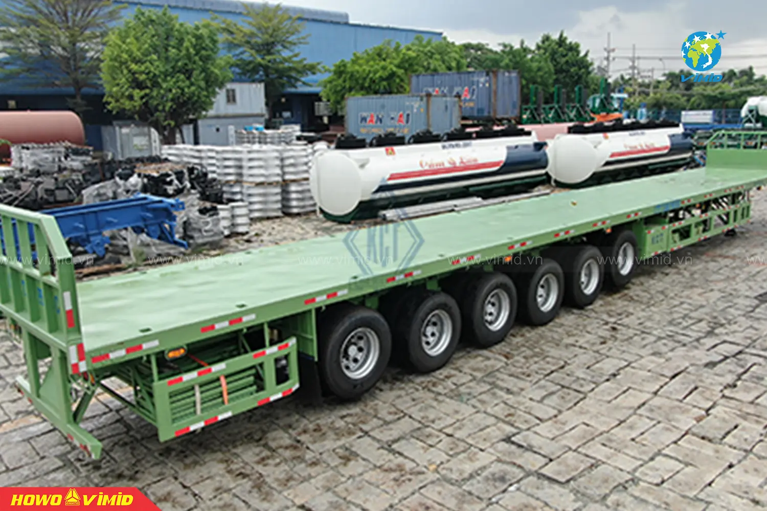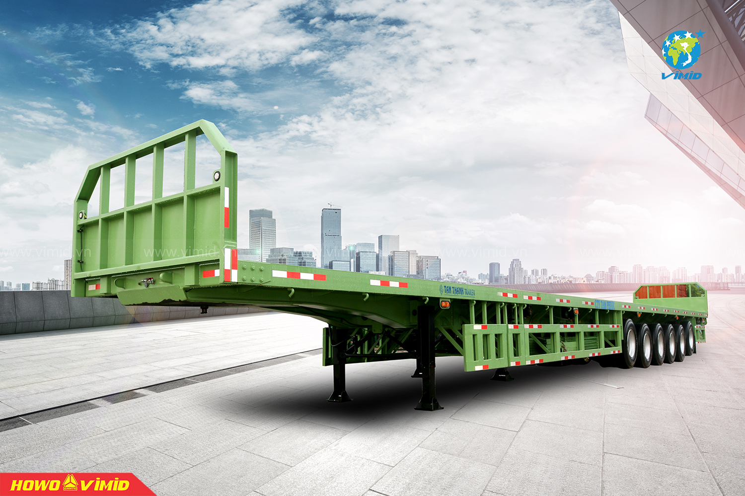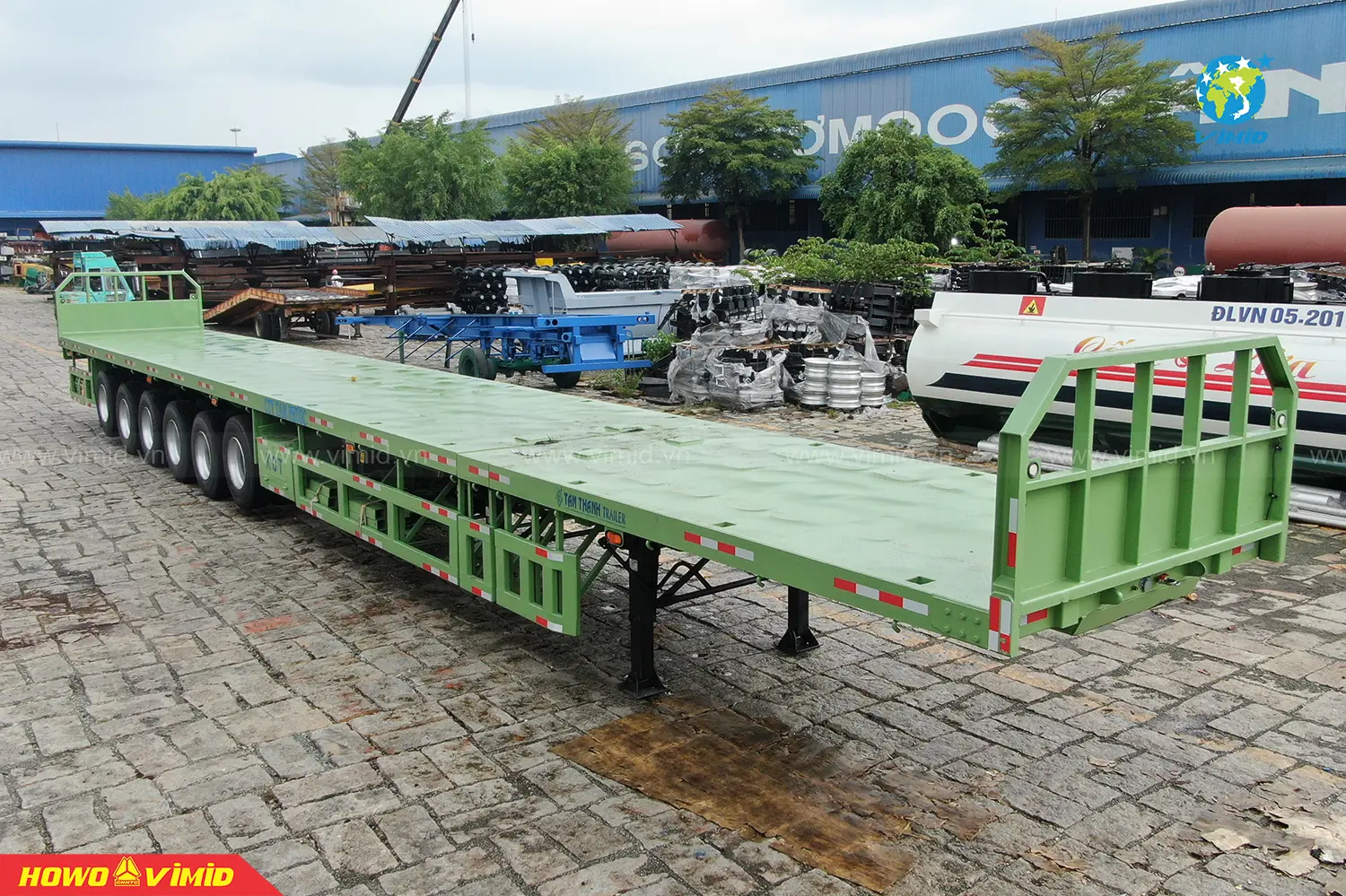 The K66-SR-01 Flatbed Semi-Trailer by Tan Thanh Mechanical Trading Joint Stock Company is manufactured on a high-tech production line, with a payload capacity of up to 57 tons, making it ideal for transporting steel pipes and steel bars.
