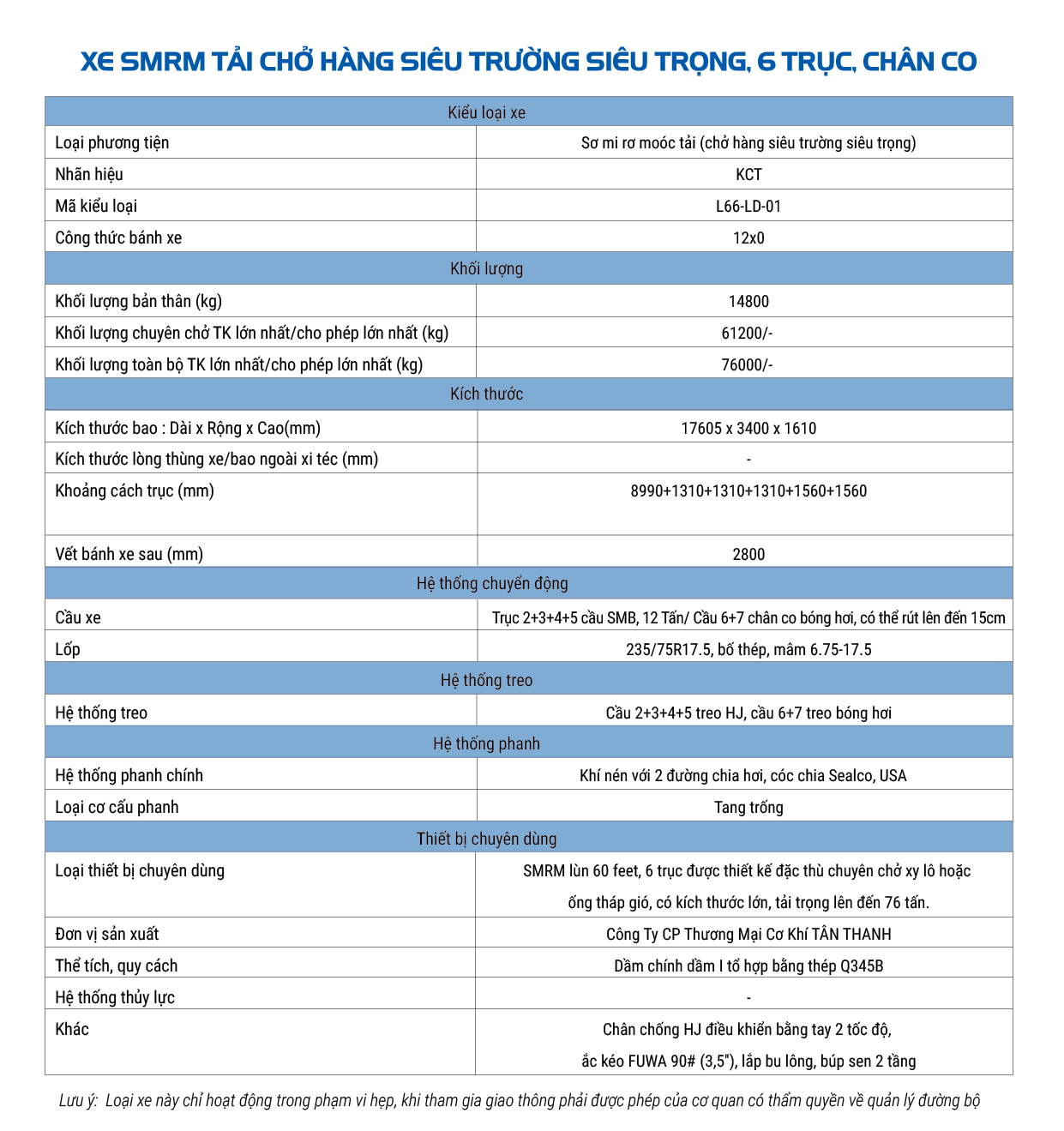 - Type: 60-feet, 6-axle lowbed semi-trailer, specially designed for transporting large-sized equipment such as cement silos or wind tubins, with a maximum payload of 76 tons