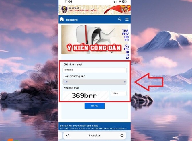 Các bước thực hiện tương tự như trên website của Cục CSGT: Nhập biển số, mã xác nhận và xem kết quả.