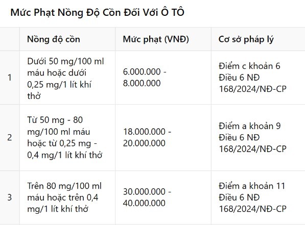 Từ năm 2025, mức phạt với ô tô vi phạm nồng độ cồn được chia thành 3 mức: