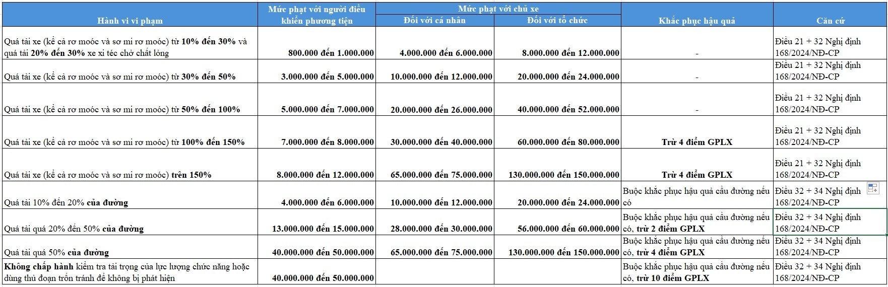 Mức phạt quá tải theo nghị định 168/2024/NĐ-CP