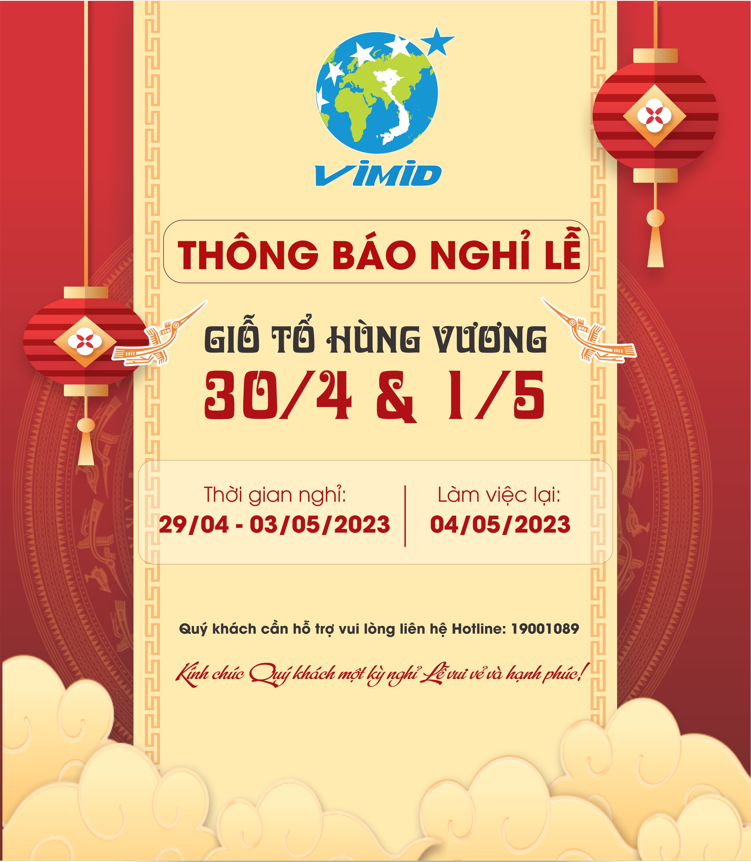 VIMID xin gửi đến Quý Khách hàng, Quý đối tác lịch nghỉ lễ Giỗ tổ Hùng Vương, Ngày Giải Phóng Miền Nam 30/4 và Ngày Quốc tế lao động 1 tháng 5 như sau: