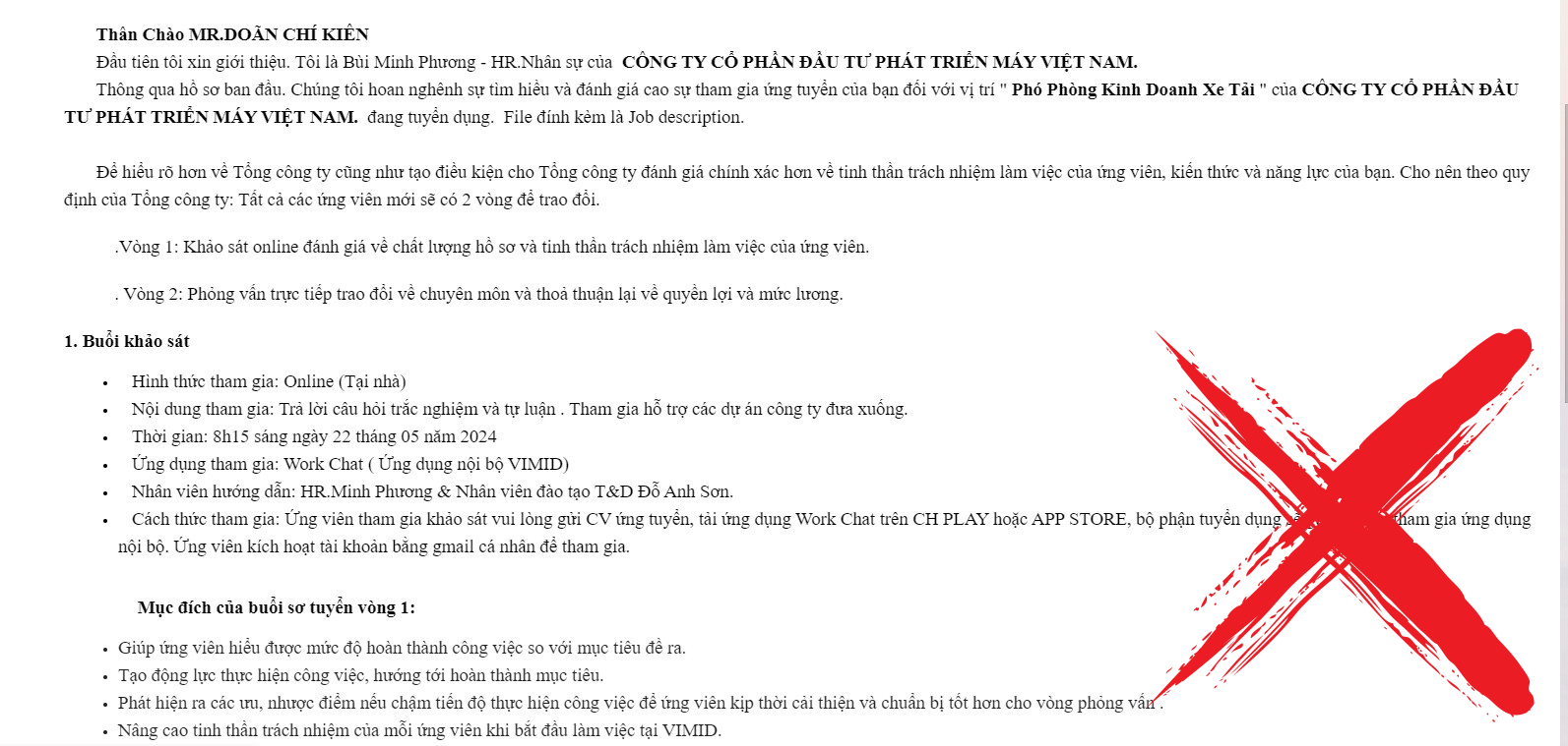 Phương thức lừa đảo bằng cách mạo danh VIMID gửi email thông báo tuyển dụng, mời phỏng vấn và yêu cầu ứng viên chuyển khoản một khoản tiền phí hoặc yêu cầu ứng viên tham gia vòng sơ tuyển online bằng cách tham gia nhóm chat, và được hướng dẫn tải ứng dụng/nhấn vào đường link…