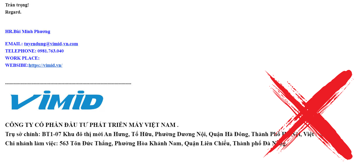 Do đó, VIMID khuyến cáo tất cả khách hàng, ứng viên nên đề cao cảnh giác trước các thủ đoạn tinh vi với các thông tin tuyển dụng của các đối tượng lừa đảo đang lan tràn hiện nay. VIMID luôn đứng về quyền lợi, lợi ích của người lao động và khách hàng.