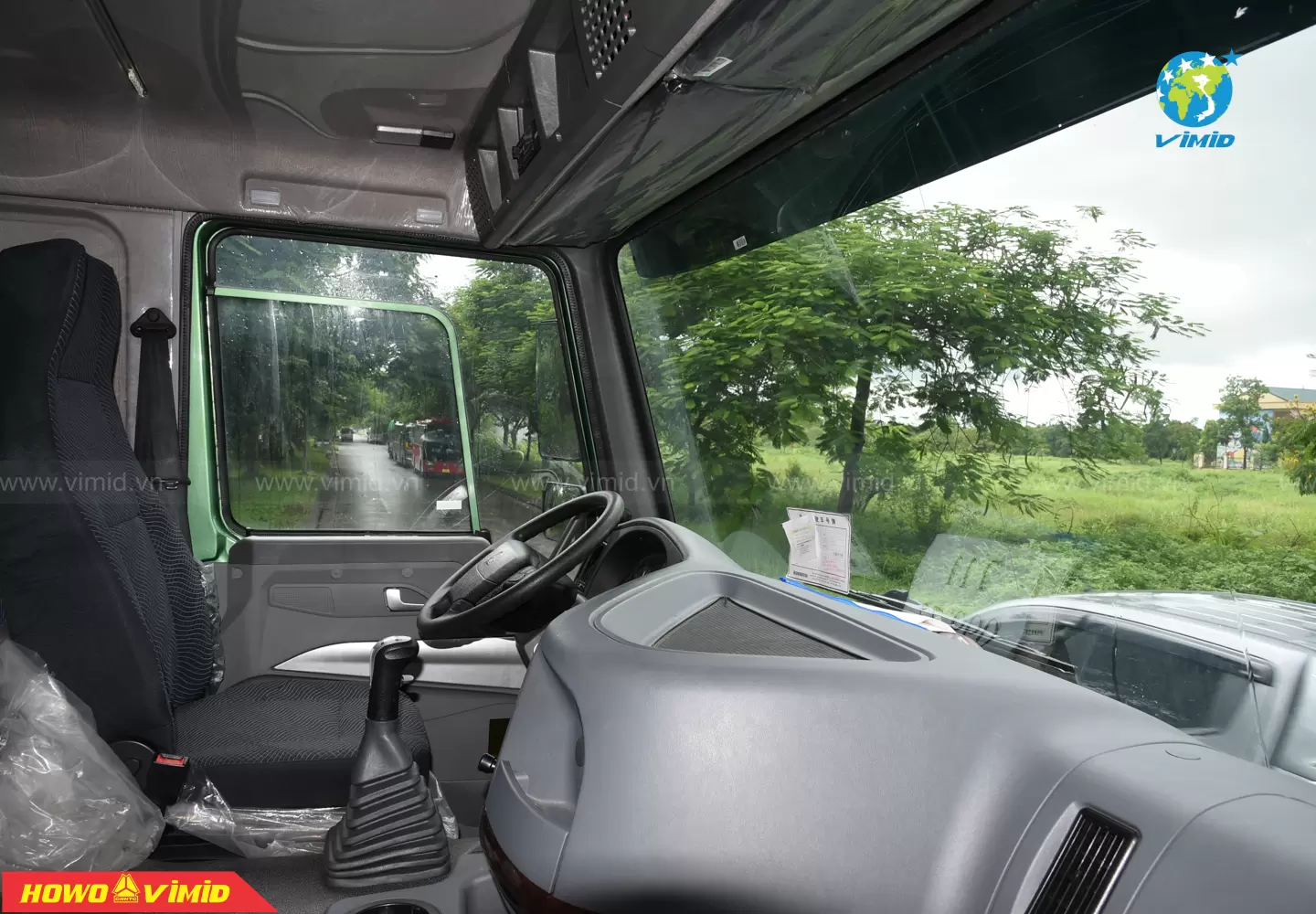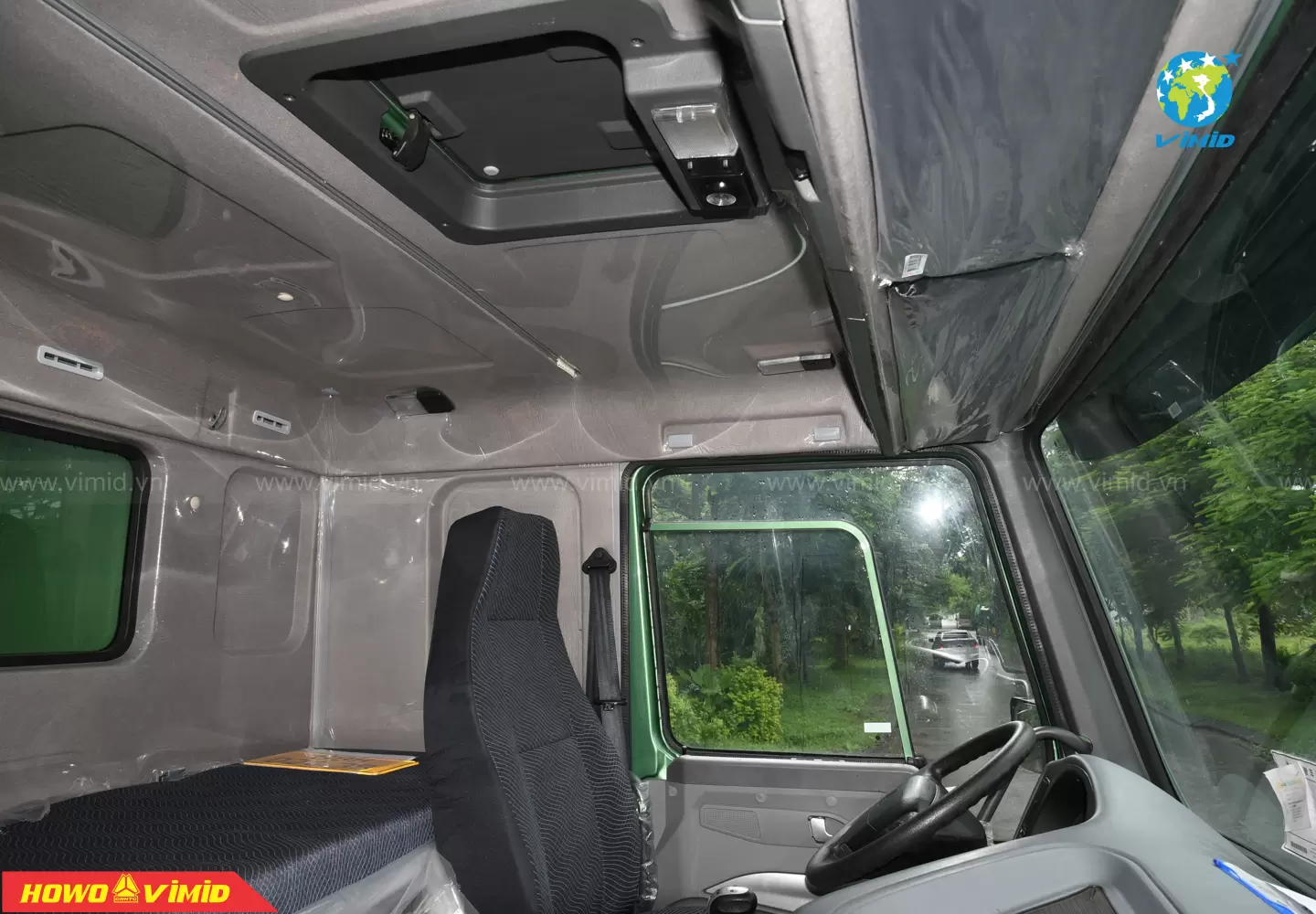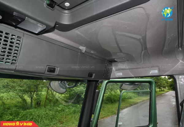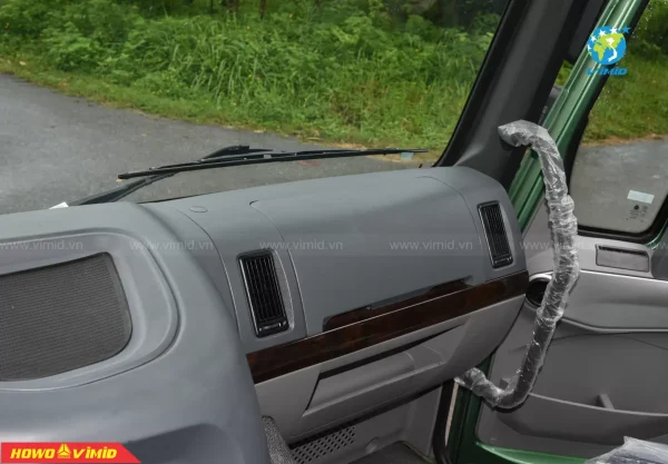 Nội thất rộng rãi với tông màu nội thất ghi xám sang trọng và hiện đại. Tầm nhìn quan sát rộng, thoải mái cho người lái. Bảng điều khiển trung tâm: Có trang bị đầy đủ chức năng như phanh cup pô, ga tự động Cruise control, cài cầu, cái cứng và công tắc cài ben cũng như các chức năng thông thường khác trên xe ben HOWO, thiết thực, đáng tin cậy, đơn giản, thanh lịch và hào phóng.