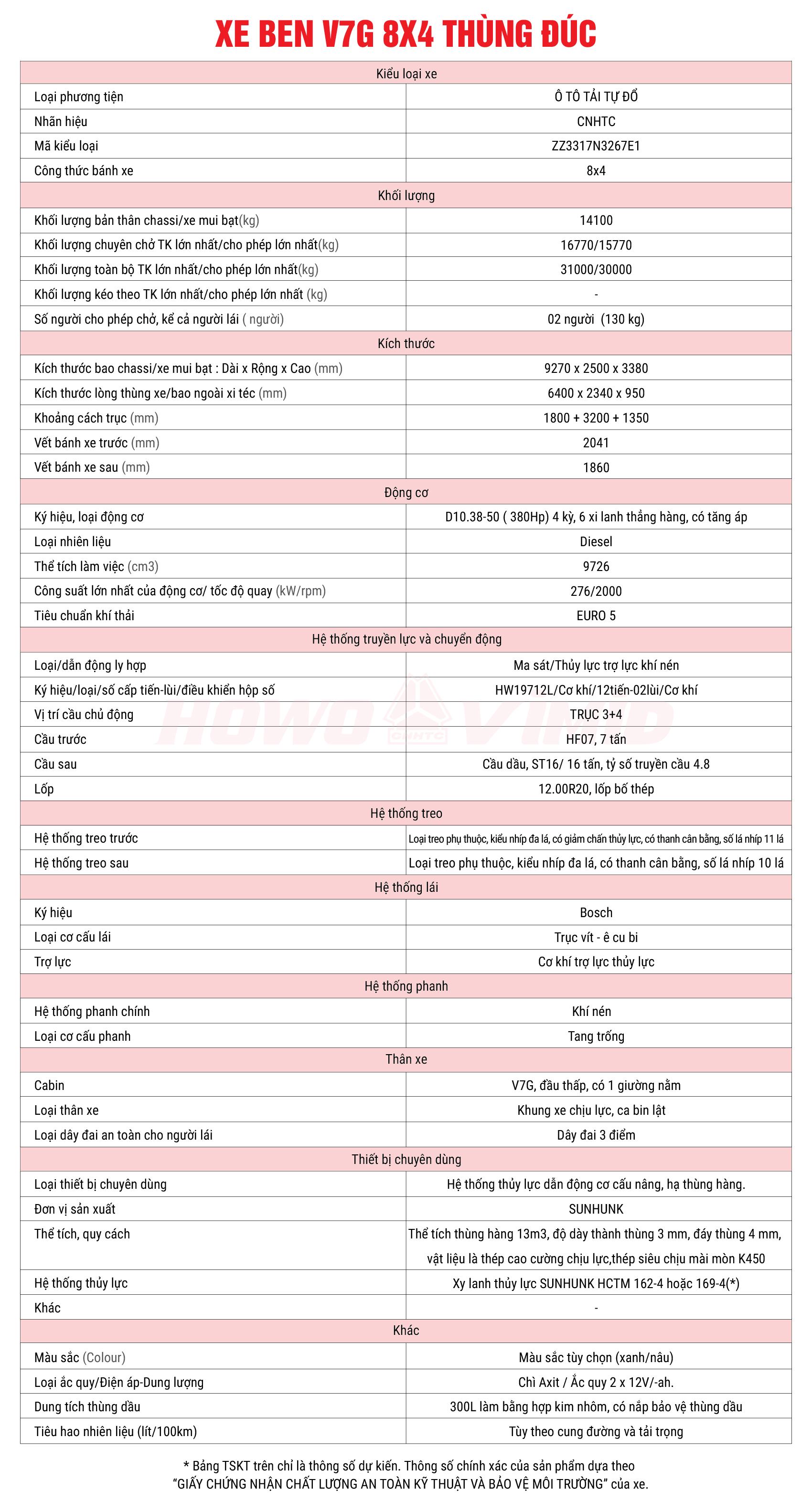Xe ben V7G 8×4 thùng đúc sử dụng hệ thống thủy lực SUNHUNK, một thương hiệu nổi tiếng đã được chứng minh qua hàng loạt sản phẩm tải ben của VIMID tại thị trường Việt Nam. Xe sử dụng tháp ben SUNHUNK HCTM-4JT-F162X5000Z (HCTM 162-4) /HCTM-4JT-F169X5000Z(HCTM 169-4) có đường kính ngoài lớn nhất là 162/169mm, chia làm 4 đốt, hành trình ben lớn nhất là 5000mm. Tháp ben HCTM 169-4 là bản thế hệ mới nhất của SUNHUNK. Thân tháp ben màu đỏ, được mạ crom chống gỉ, khả năng vận hành ổn định hơn trọng mọi điều kiện khí hậu.