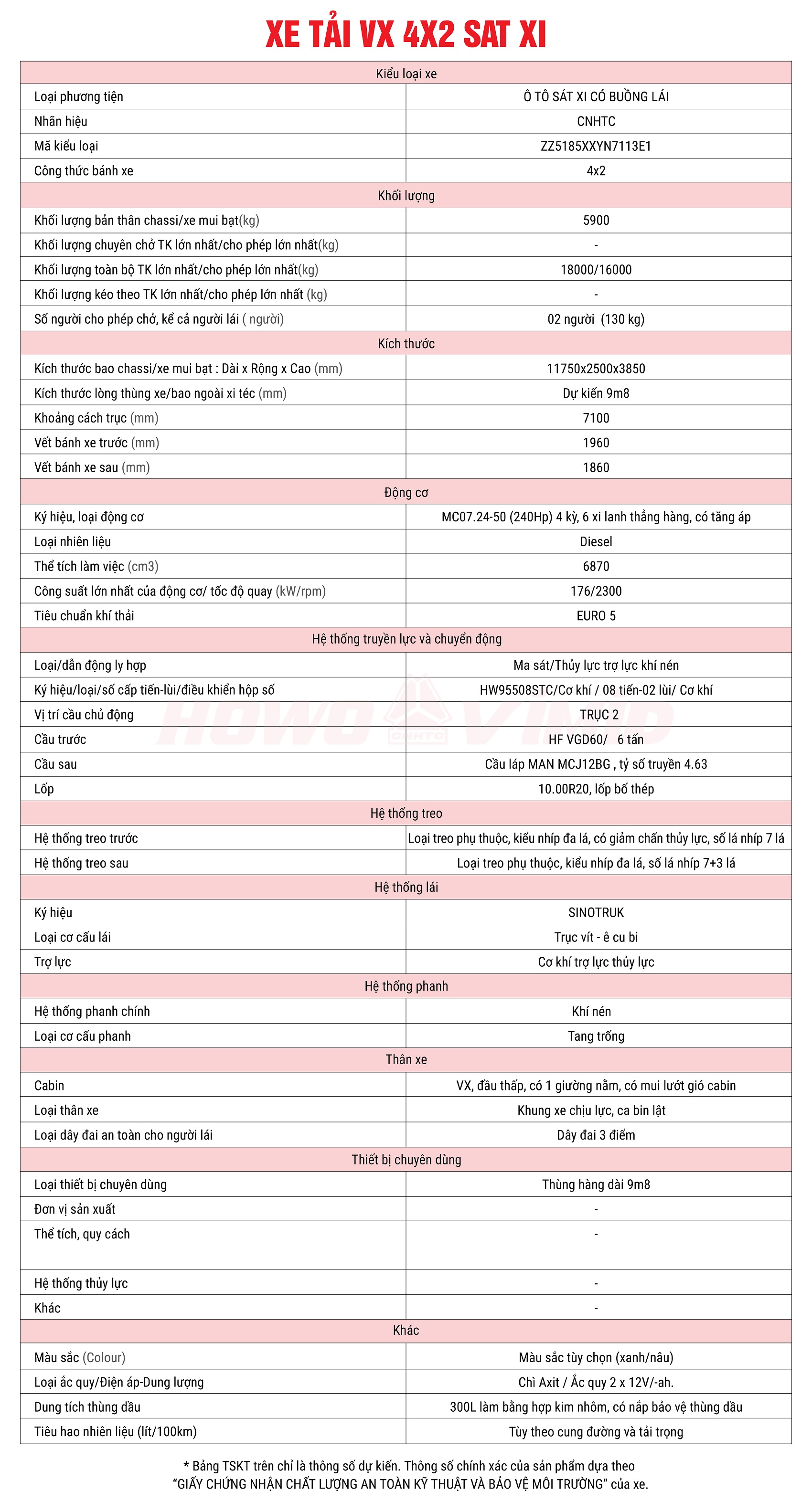 CÁC ĐẶC ĐIỂM CHÍNH CỦA XE TẢI VX 4×2 SÁT XI