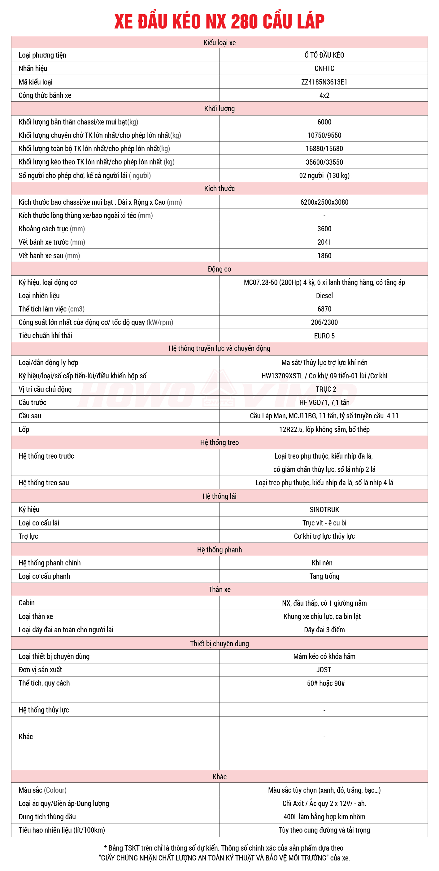 • Xe Đầu kéo NX 280 cầu láp sở hữu công suất lớn 280 mã lực với mức mô xoắn cực đại tới 1100 N.m, hoạt động mạnh mẽ, bền bỉ.