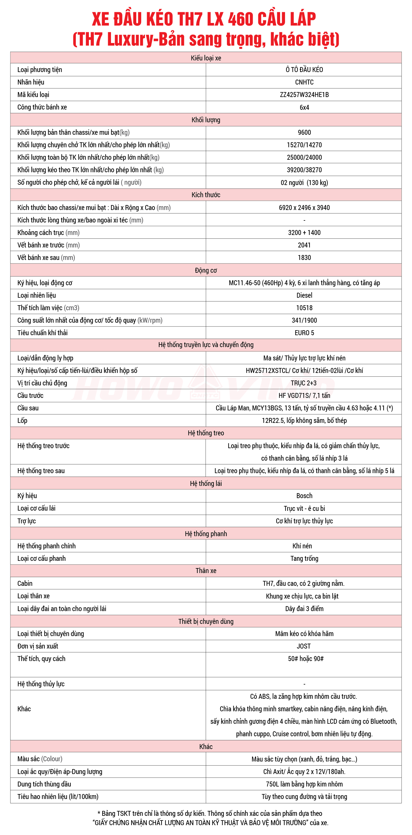 Xe đầu kéo TH7 LX 460 cầu láp có ngoại quan đẹp hơn, mới hơn, sang trọng hơn với nhiều thiết kế nổi bật. Phục vụ đa dạng nhu cầu vận chuyển hàng hóa, đặc biệt là vận tải hàng hóa đường dài, đường trường rất tốt, giúp khách hàng có trải nghiệm mới về sự cân bằng giữa chi phí và chất lượng sản phẩm.