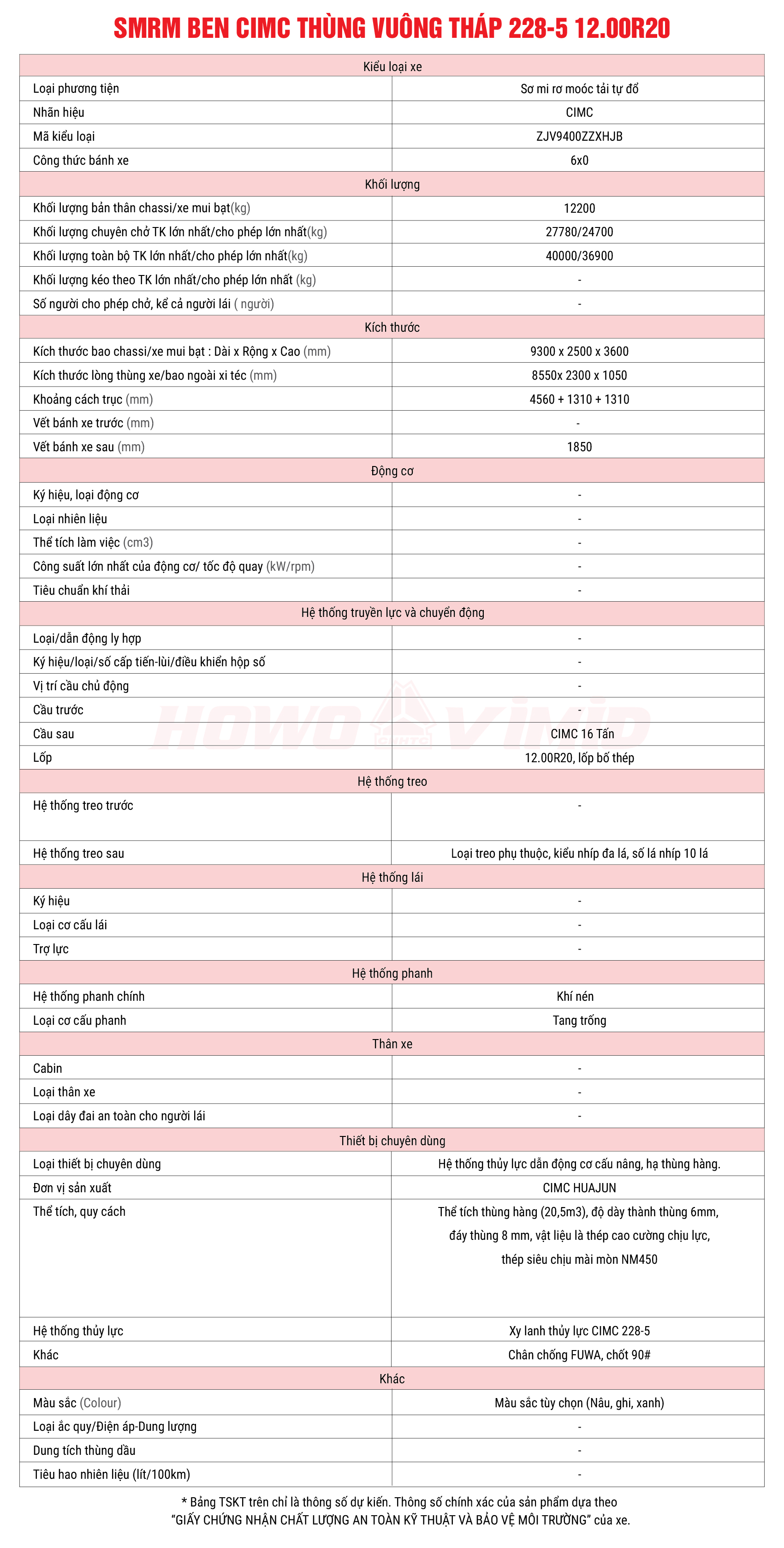 SMRM ben CIMC thùng vuông tháp 228-5 12.00R20 đây là một trong những sản phẩm mới được VIMID và SUNHUNK nghiên cứu thiết kế và phát triển với những cải tiến vượt trội phục vụ đa dạng nhu cầu vận chuyển như vận chuyển hàng hóa, chạy mỏ, quặng, chạy trong công trình trên nhiều điều kiện địa hình khác nhau.
