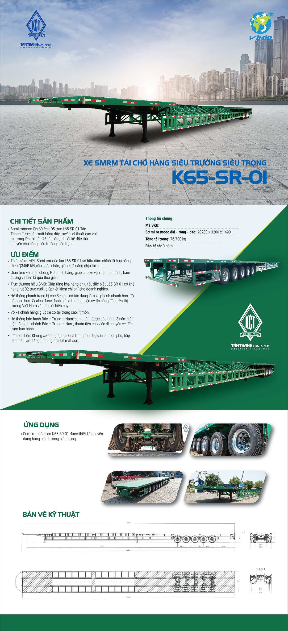 Xe SMRM K65-SR-01 hay là Sơ Mi Rơ Moóc Lùn K65-SR-01 60 feet 5 trục sản xuất trên dây chuyền công nghệ cao với tải trọng lên tới gần 76 tấn,xe được sử dụng chuyên chở hàng siêu trường siêu trọng.