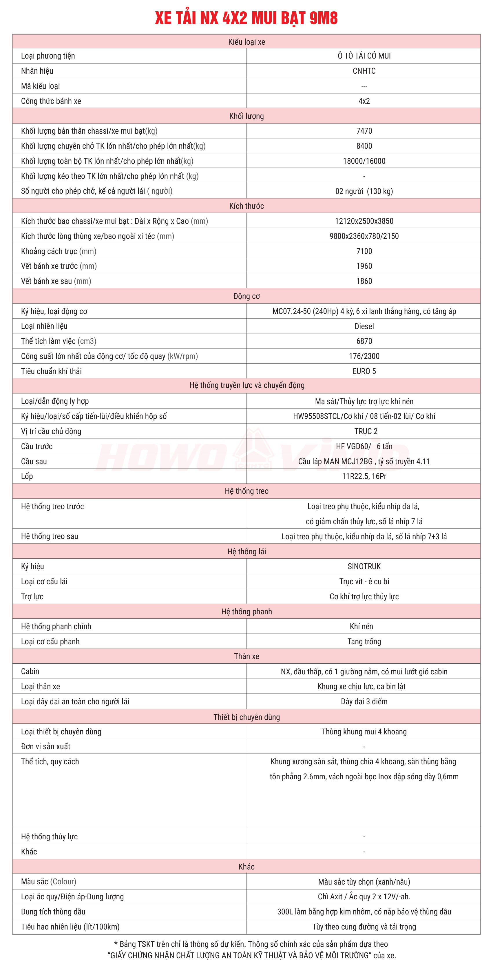 Sản phẩm chất lượng, cấu hình cao, phối bộ đáng tin cậy, ít hỏng hóc: Động cơ công nghệ MAN MC07, tuổi thọ động cơ cao 1,5 triệu km, hộp số SINO HW95508STC bền bỉ, sử dụng dòng cầu công nghệ MAN MCJ12BG với chất lượng và độ bền vượt trội. Khung sát xi, hệ thống nhíp chắc khỏe chở tải cao mang lại sự an toàn, hiệu quả đầu tư cao. Chi phí đầu tư phù hợp cùng chế độ bảo hành dài hạn lên tới 2 năm hoặc 200.000 km