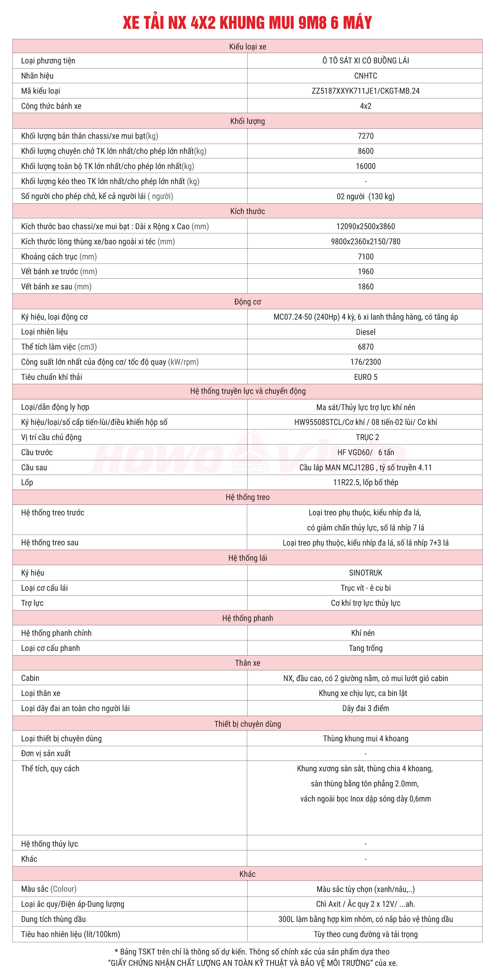 – Loại lốp: 11R22.5, lốp có săm, bố thép.